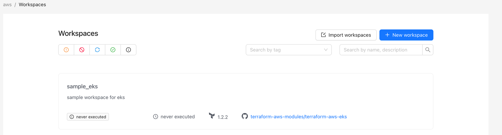 Upon first login, we are greeted with preloaded sample organization, workspace, etc.